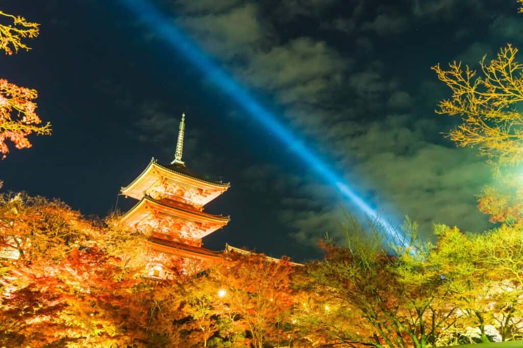 Ending our journey with a bang, Kiyomizu-dera offers panoramic views of Kyoto that will take your breath away. The temple’s main hall extends over the hillside, supported by impressive wooden pillars, creating an iconic sight.